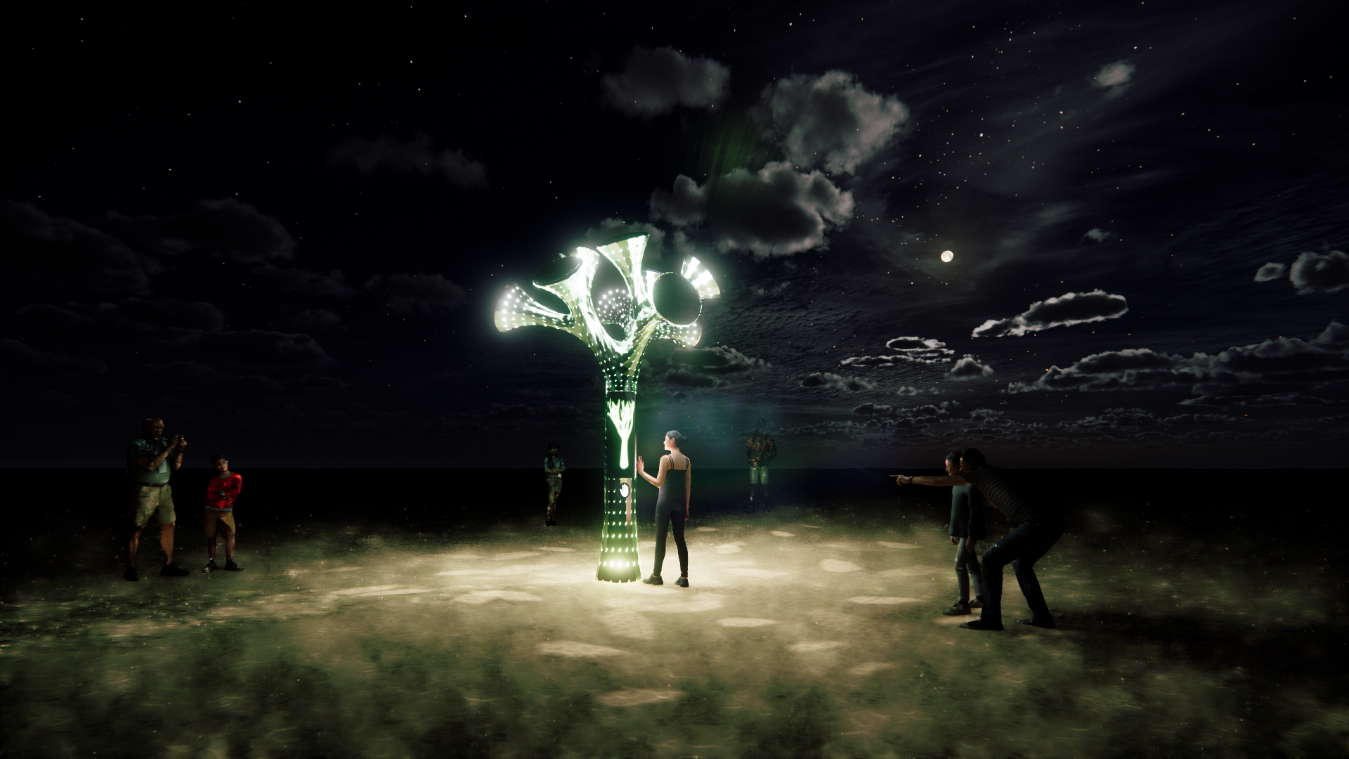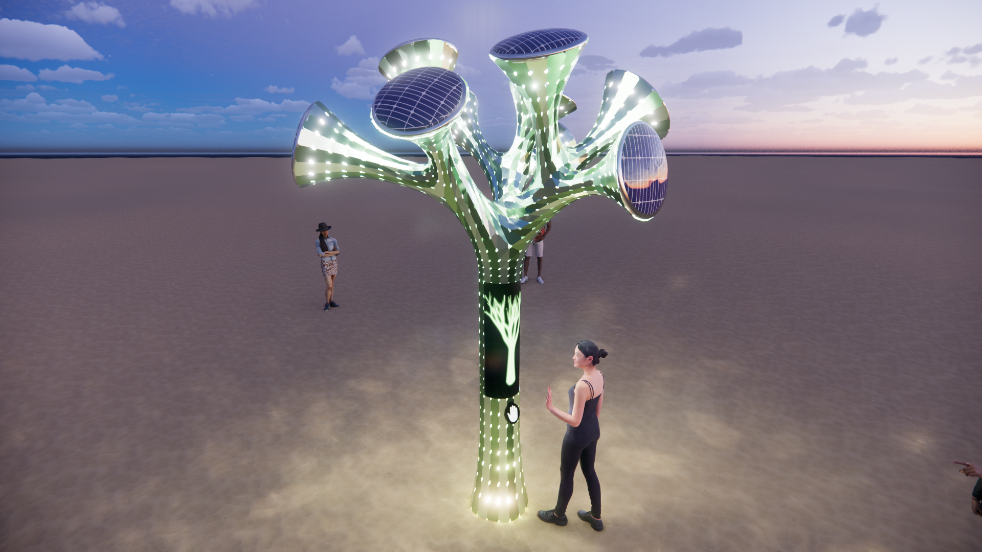 ISEED features a sleek aluminum sculpture shaped like a tree, which houses a sophisticated hand-scanning sensor. A custom software system powers the interactive experience, projecting vibrant animations onto a flexible LED screen. Atop the sculpture, UFO-like solar lights cast a magical glow, enhancing the ethereal atmosphere of the installation.