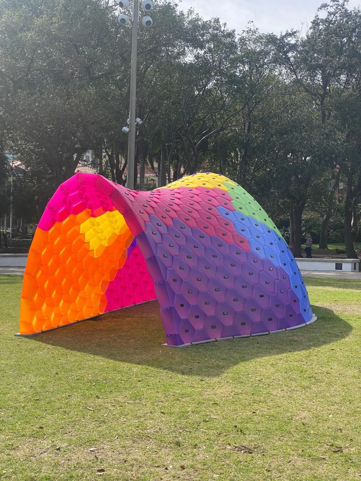 Thanks, CODAworx for highlighting my work, whose contributions to the public art sector are exemplified in the project, SOLAR HIVE. This project showcases a self-sustaining organism installation that invites people to enter and experience a media facade powered entirely by solar energy. By day, solar cells charge, and by night, visitors are treated to a dynamic display of illuminated hexagonal vibrant colors.